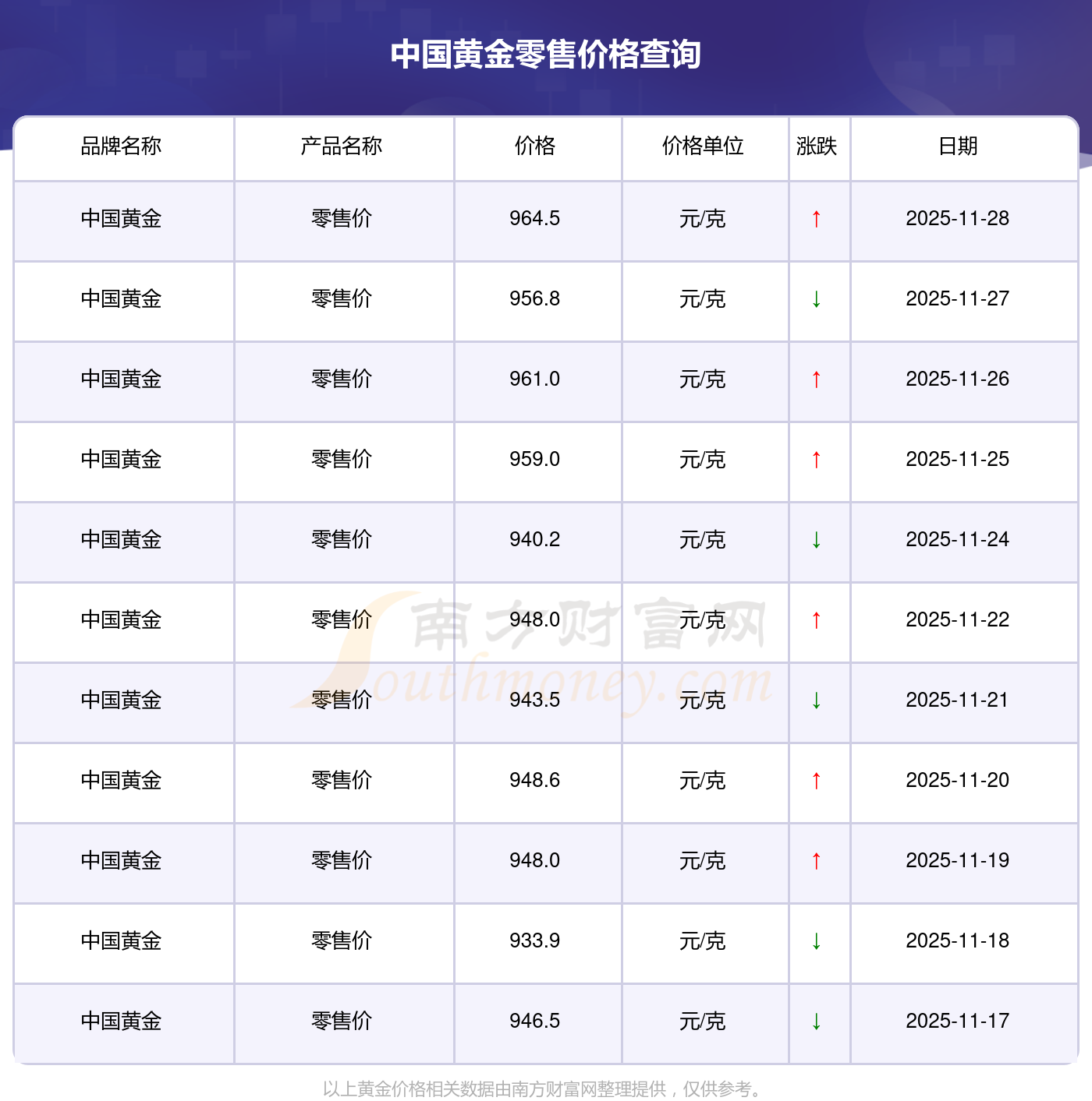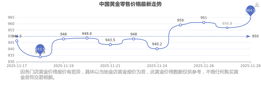 今日中國(guó)黃金零售價(jià)格最新是964.5元/克。