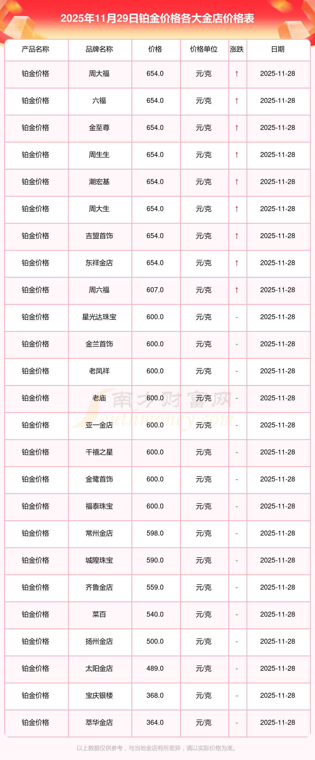 2025年11月29日,星光達(dá)珠寶、星光達(dá)珠寶、寶泉錢幣、金蘭首飾、金蘭首飾、謝瑞麟、謝瑞麟、謝瑞麟、謝瑞麟、謝瑞麟、金銀街等各大金店品牌鉑金價格今日價格如下:星光達(dá)珠寶1321.0元/克、星光達(dá)珠寶600.0元/克、寶泉錢幣12.6元/克、金蘭首飾1321.0元/克、金蘭首飾600.0元/克、謝瑞麟1207.0元/克、謝瑞麟1321.0元/克、謝瑞麟46370.0、謝瑞麟13970.0、謝瑞麟41860.0、金銀街1296.0元/克。