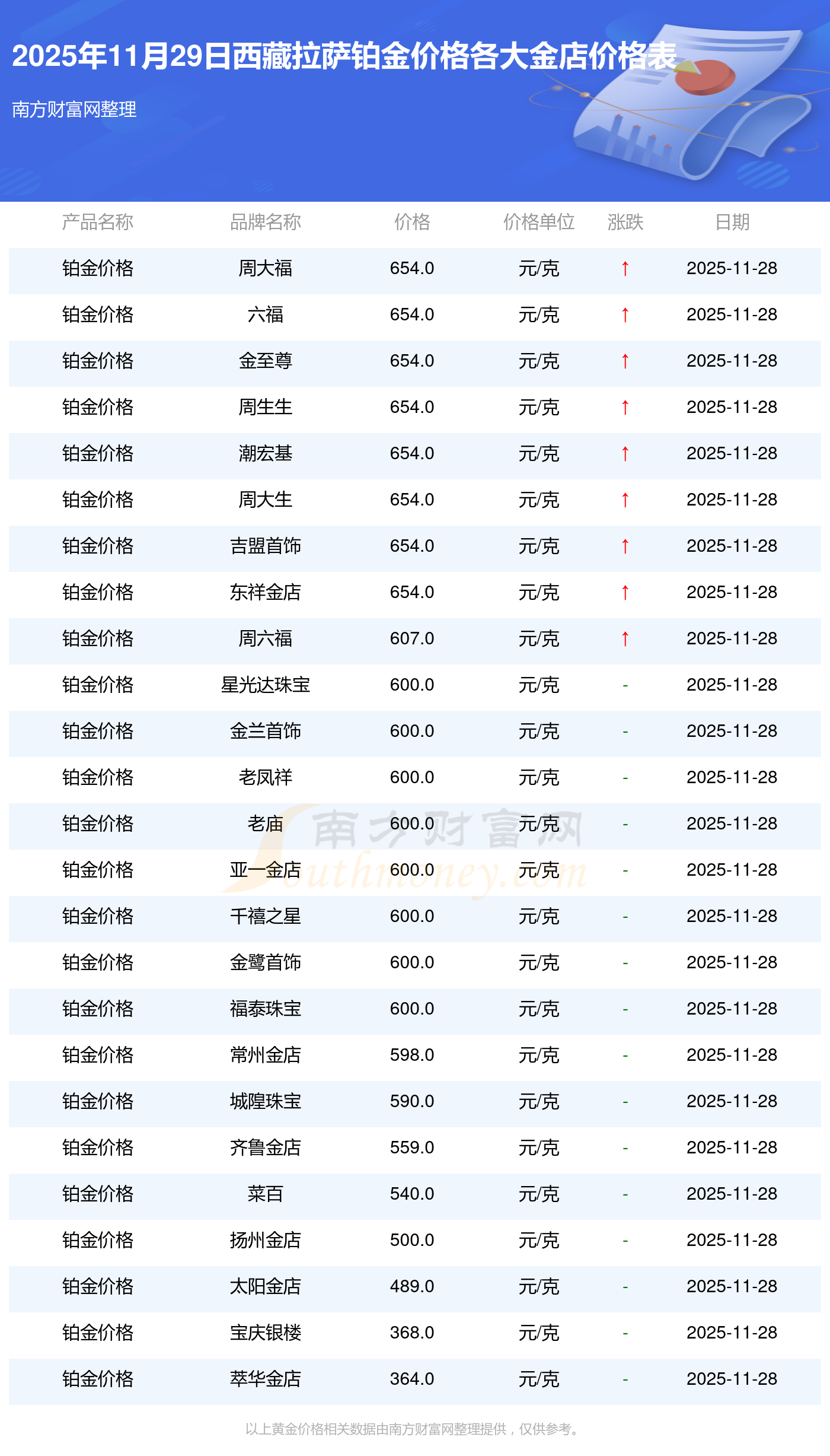 2025年11月29日,西藏拉薩星光達珠寶、星光達珠寶、寶泉錢幣、金蘭首飾、金蘭首飾、謝瑞麟、謝瑞麟、謝瑞麟、謝瑞麟、謝瑞麟、金銀街等各大金店品牌鉑金價格今日價格如下:星光達珠寶1321.0元/克、星光達珠寶600.0元/克、寶泉錢幣12.6元/克、金蘭首飾1321.0元/克、金蘭首飾600.0元/克、謝瑞麟1207.0元/克、謝瑞麟1321.0元/克、謝瑞麟46370.0、謝瑞麟13970.0、謝瑞麟41860.0、金銀街1296.0元/克。