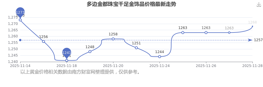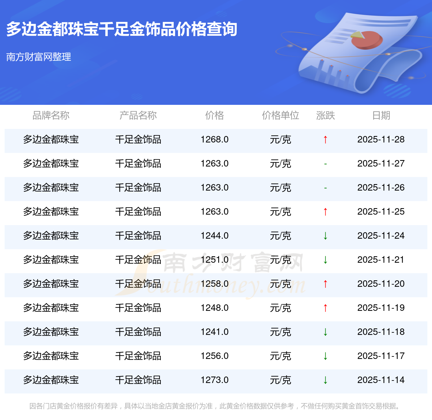 今日(2025年11月29日),多邊金都珠寶千足金飾品價(jià)格:1268.0元/克。