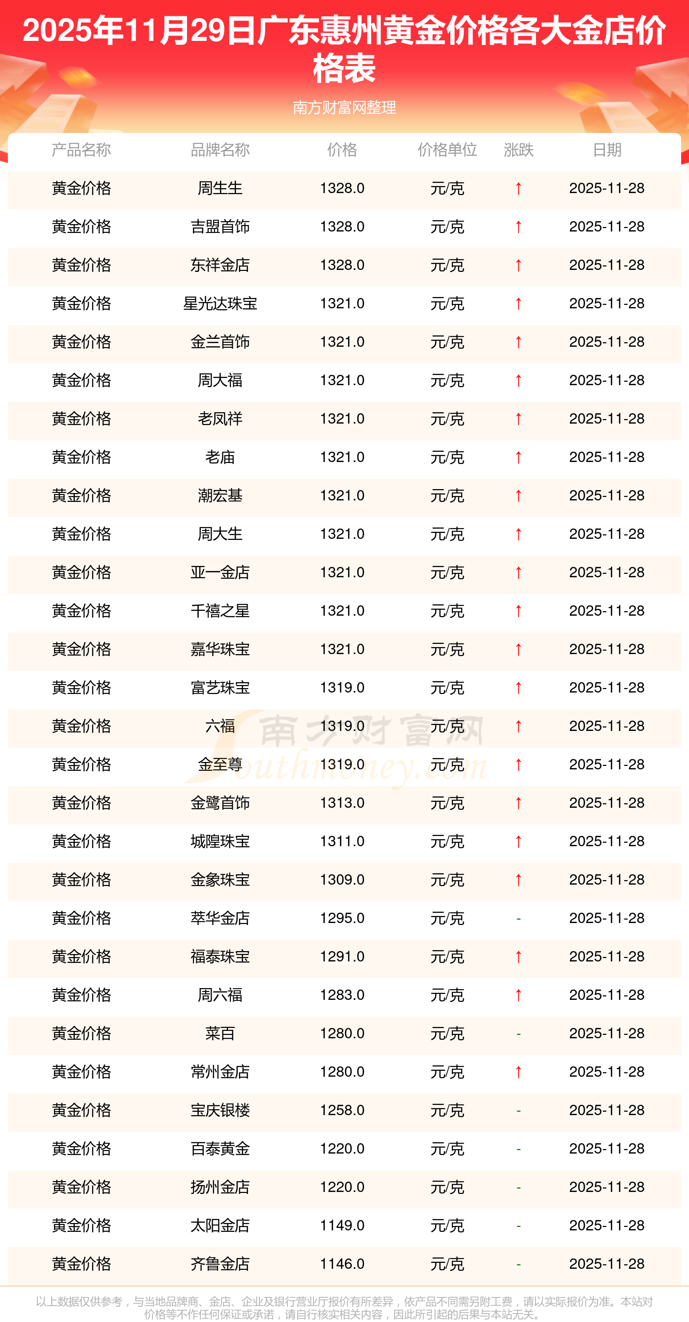 2025年11月29日廣東惠州各大金店黃金價格最新價格查詢來了:星光達珠寶1321.0元/克,星光達珠寶600.0元/克,寶泉錢幣12.6元/克,金蘭首飾1321.0元/克,金蘭首飾600.0元/克,謝瑞麟1207.0元/克,謝瑞麟1321.0元/克,謝瑞麟46370.0,謝瑞麟13970.0,謝瑞麟41860.0,金銀街1296.0元/克。