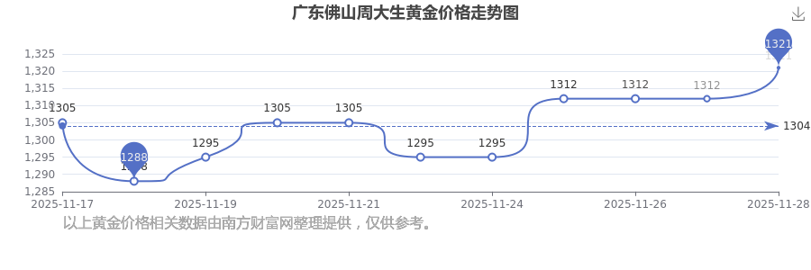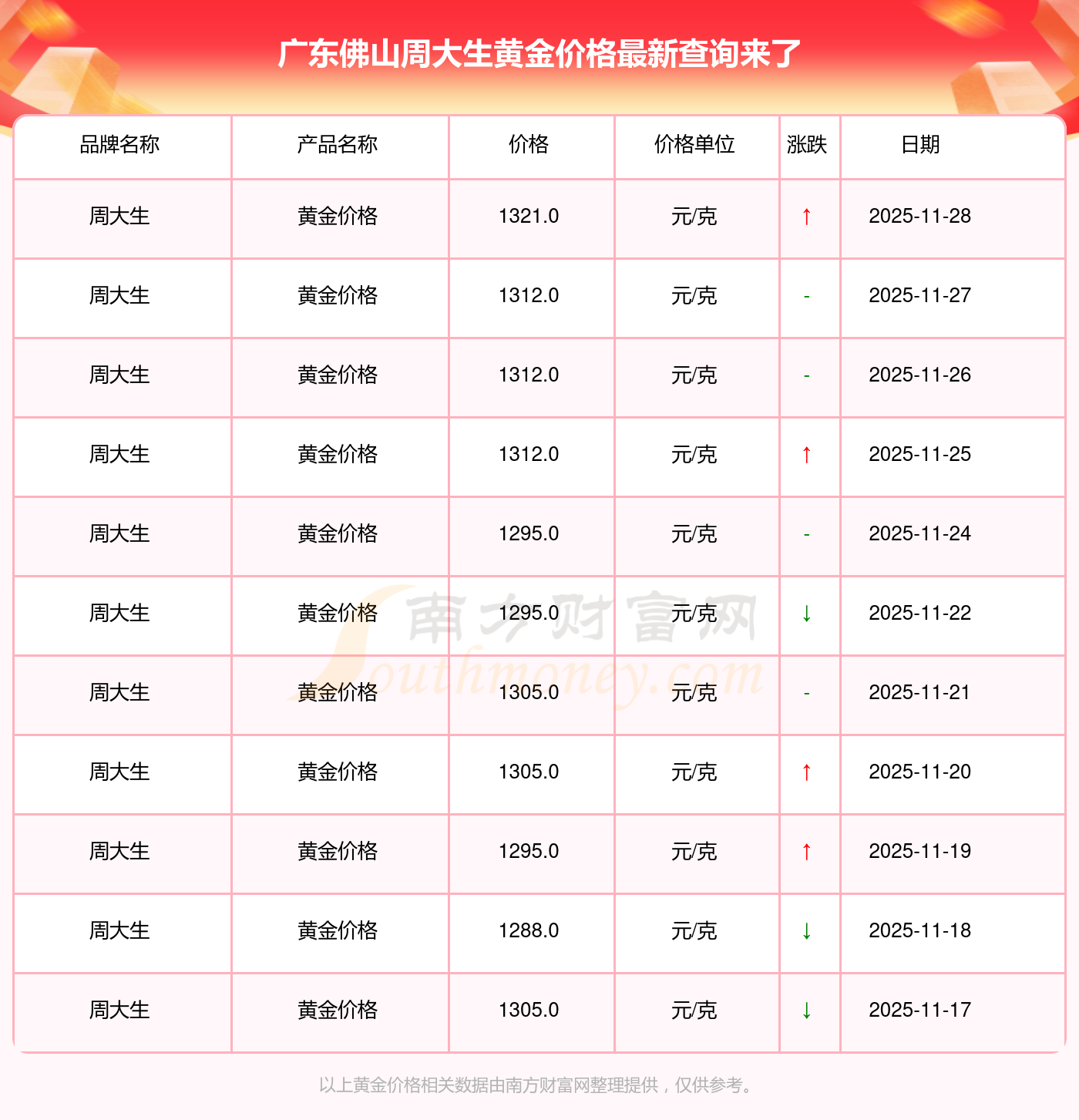 廣東佛山周大生在 2025年11月29日,黃金價(jià)格的售賣價(jià)格是 1321.0元/克。