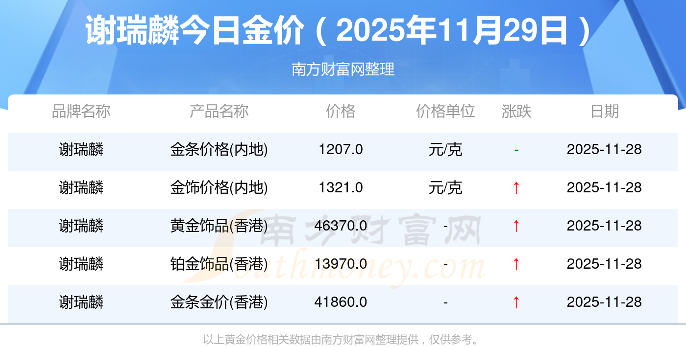 2025年11月29日謝瑞麟今日價格:黃金價格1321.0元/克,鉑金價格600.0元/克,銀條價格12.6元/克,黃金價格1321.0元/克,鉑金價格600.0元/克,金條價格(內(nèi)地)1207.0元/克,金飾價格(內(nèi)地)1321.0元/克,黃金飾品(香港)46370.0,鉑金飾品(香港)13970.0,金條金價(香港)41860.0,投資金條1296.0元/克。