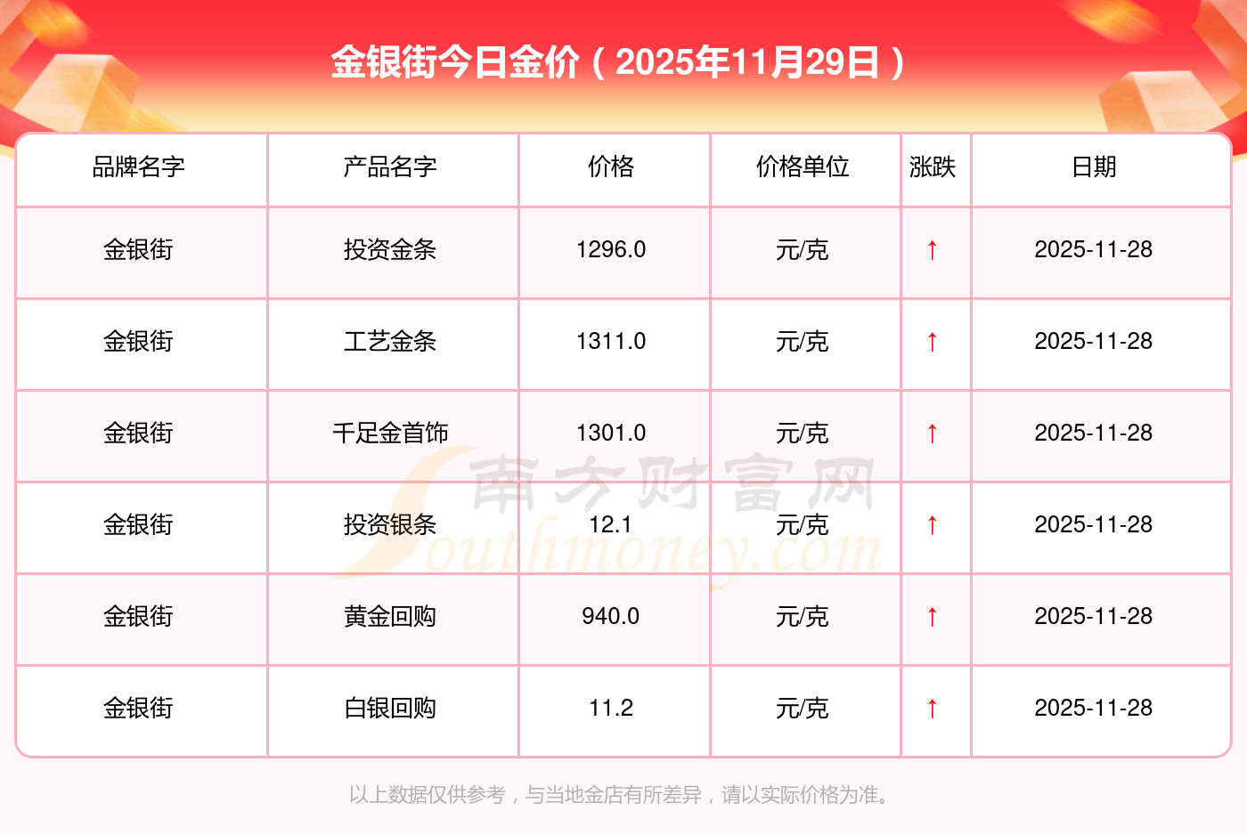 2025年11月29日金銀街今日價(jià)格:黃金價(jià)格1321.0元/克,鉑金價(jià)格600.0元/克,銀條價(jià)格12.6元/克,黃金價(jià)格1321.0元/克,鉑金價(jià)格600.0元/克,金條價(jià)格(內(nèi)地)1207.0元/克,金飾價(jià)格(內(nèi)地)1321.0元/克,黃金飾品(香港)46370.0,鉑金飾品(香港)13970.0,金條金價(jià)(香港)41860.0,投資金條1296.0元/克。
