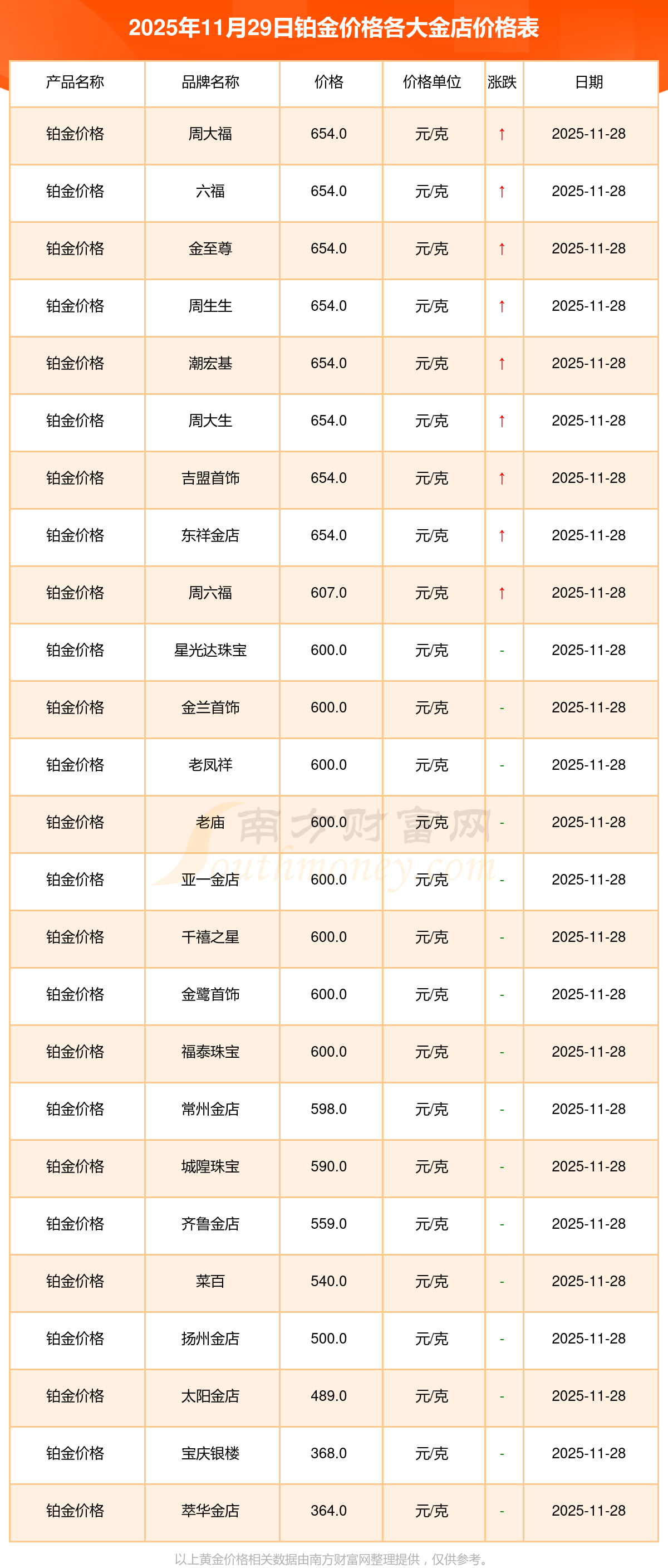 2025年11月29日各大金店鉑金價格最新價格:星光達珠寶1321.0元/克,星光達珠寶600.0元/克,寶泉錢幣12.6元/克,金蘭首飾1321.0元/克,金蘭首飾600.0元/克,謝瑞麟1207.0元/克,謝瑞麟1321.0元/克,謝瑞麟46370.0,謝瑞麟13970.0,謝瑞麟41860.0,金銀街1296.0元/克。