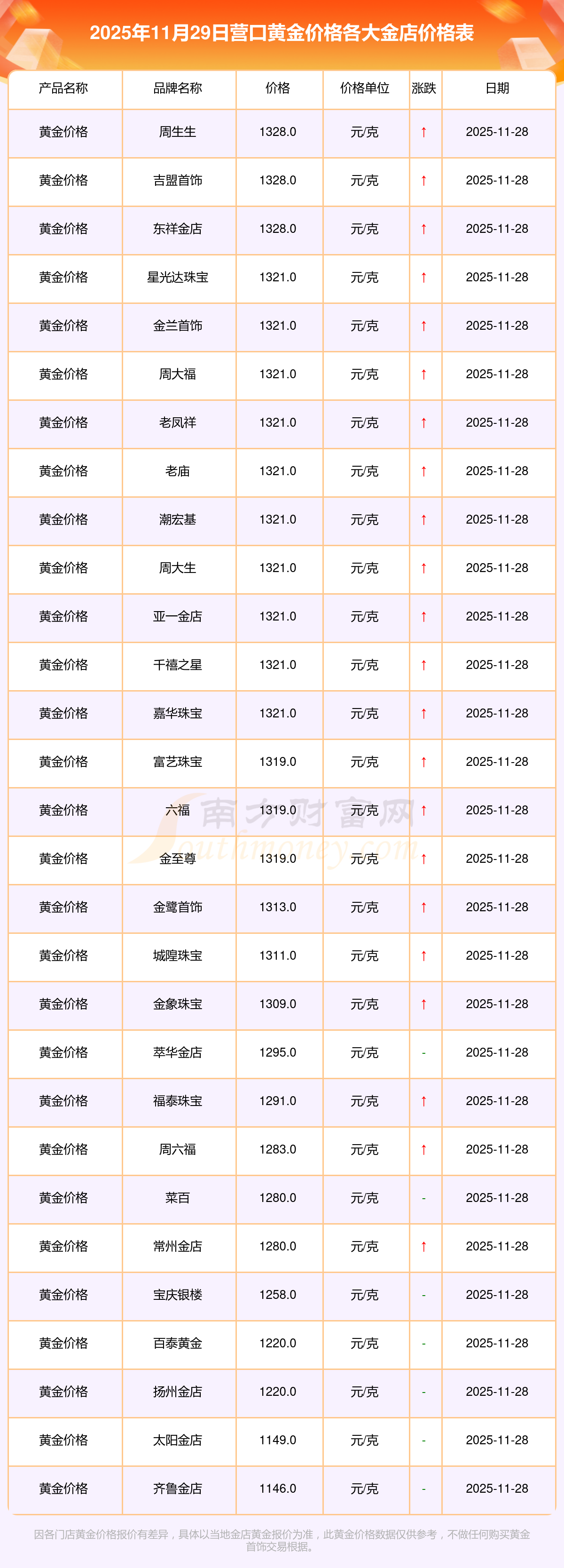2025年11月29日營(yíng)口星光達(dá)珠寶、星光達(dá)珠寶、寶泉錢(qián)幣、金蘭首飾、金蘭首飾、謝瑞麟、謝瑞麟、謝瑞麟、謝瑞麟、謝瑞麟、金銀街等各大金店品牌黃金價(jià)格最新價(jià)格如下:星光達(dá)珠寶黃金價(jià)格1321.0元/克,星光達(dá)珠寶鉑金價(jià)格600.0元/克,寶泉錢(qián)幣銀條價(jià)格12.6元/克,金蘭首飾黃金價(jià)格1321.0元/克,金蘭首飾鉑金價(jià)格600.0元/克,謝瑞麟金條價(jià)格(內(nèi)地)1207.0元/克,謝瑞麟金飾價(jià)格(內(nèi)地)1321.0元/克,謝瑞麟黃金飾品(香港)46370.0,謝瑞麟鉑金飾品(香港)13970.0,謝瑞麟金條金價(jià)(香港)41860.0,金銀街投資金條1296.0元/克。