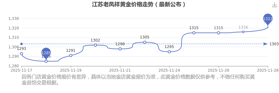 今天黃金每克的價值是多少?今日江蘇老鳳祥黃金價格查詢,江蘇老鳳祥黃金價格在 2025年11月29日,其市場價格為 1321.0元/克。