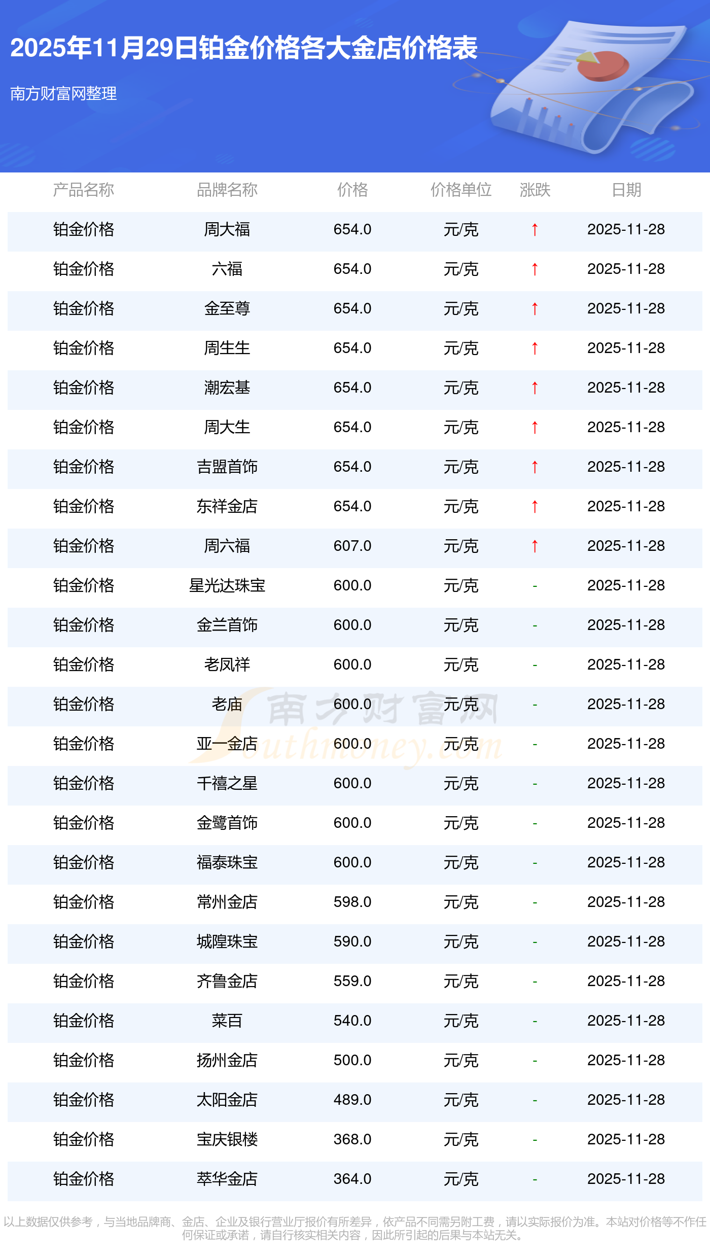 2025年11月29日,星光達珠寶、星光達珠寶、寶泉錢幣、金蘭首飾、金蘭首飾、謝瑞麟、謝瑞麟、謝瑞麟、謝瑞麟、謝瑞麟、金銀街等各大金店品牌鉑金價格今日價格如下:星光達珠寶1321.0元/克、星光達珠寶600.0元/克、寶泉錢幣12.6元/克、金蘭首飾1321.0元/克、金蘭首飾600.0元/克、謝瑞麟1207.0元/克、謝瑞麟1321.0元/克、謝瑞麟46370.0、謝瑞麟13970.0、謝瑞麟41860.0、金銀街1296.0元/克。