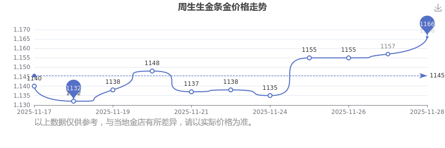 今日(2025年11月29日)周生生金條金價(jià)格為1166.0元/克。