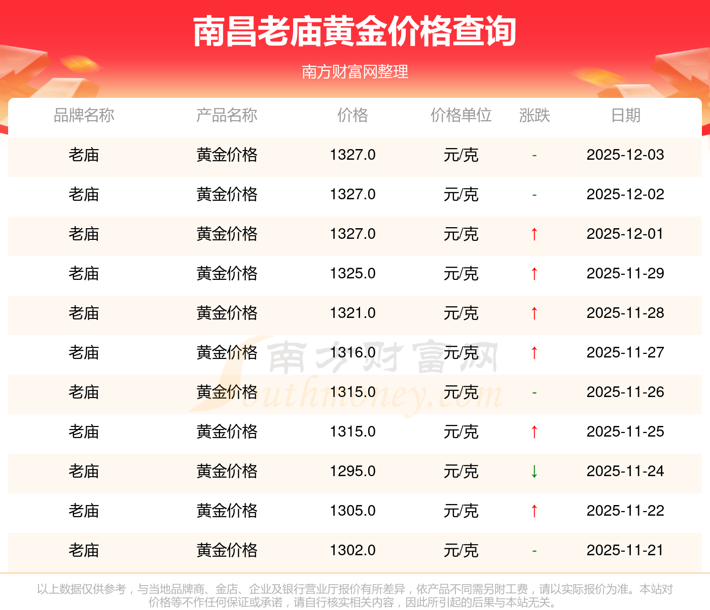2025年12月3日,南昌老廟的黃金價(jià)格標(biāo)價(jià)達(dá)到 1327.0元/克。