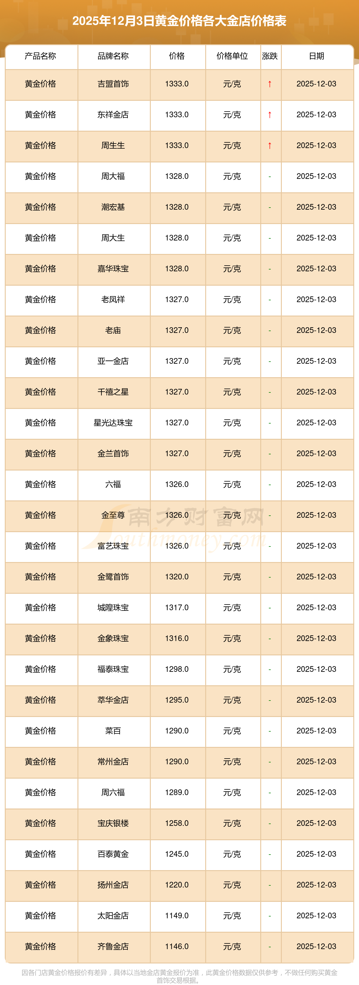 2025年12月3日周大福、周大福、周大福、周大福、周大福、周大福、周大福、老鳳祥、老鳳祥、老鳳祥、六福等各大金店品牌黃金價(jià)格最新價(jià)格如下:周大福黃金價(jià)格1328.0元/克,周大福鉑金價(jià)格663.0元/克,周大福飾品金價(jià)(內(nèi)地)1328.0元/克,周大福黃金飾品(香港)46770.0,周大福鉑金價(jià)格(香港)18990.0,周大福金條價(jià)格(香港)42190.0,周大福金條金價(jià)(內(nèi)地)1165.0元/克,老鳳祥黃金價(jià)格1327.0元/克,老鳳祥鉑金價(jià)格600.0元/克,老鳳祥足金價(jià)格1327.0元/克,六福黃金價(jià)格1326.0元/克。
