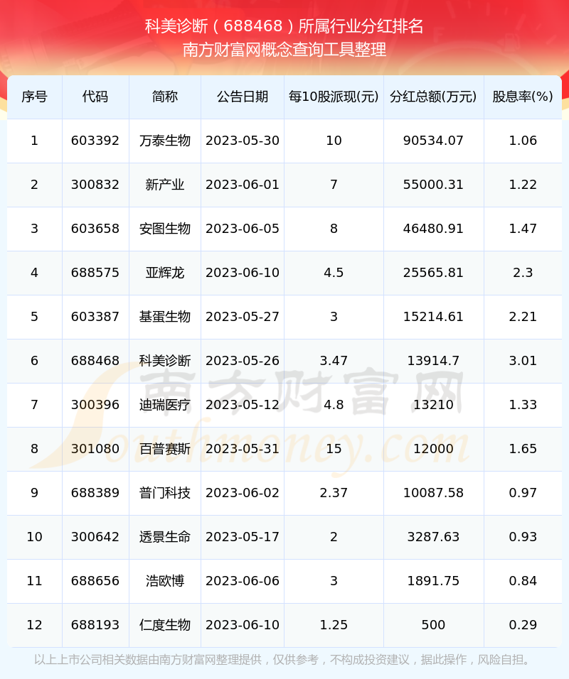 按照南方財富網(wǎng)趨勢選股系統(tǒng)統(tǒng)計,科美診斷所屬行業(yè)為試劑行業(yè),試劑行業(yè)分紅排名情況如下表: